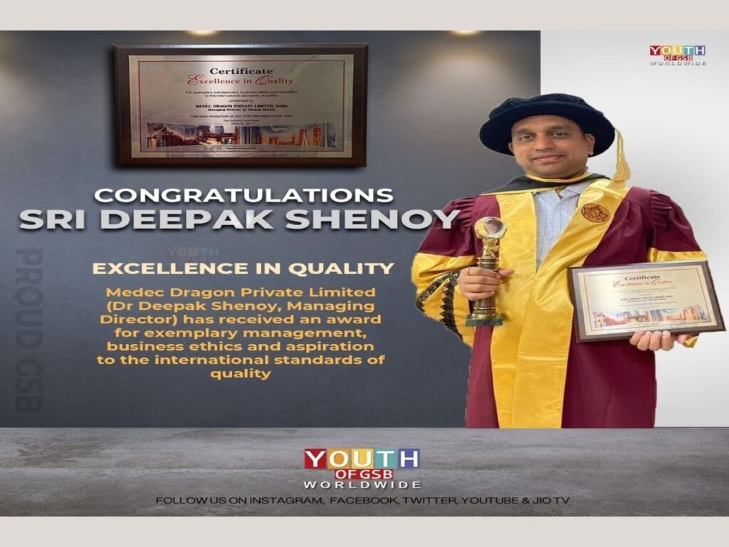 New Delhi (India), January 25: Medec Dragon Pvt Limited , One of India’s Leading manufacturers and exporter of Anti Cancer and Anti Malarial Drugs, was Awarded The “ Best Pharmaceutical Company of the Year 2021 “ by European Business Assembly. Dr Deepak Shenoy Promoter and Managing Director, received the award on behalf of the company.